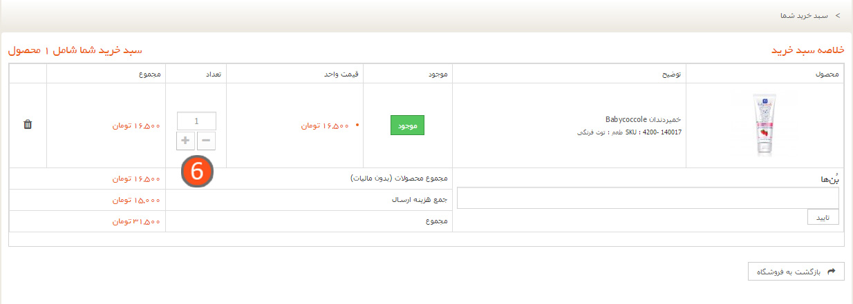 اگر از کالای انتخابی بیشتر از یک عدد می خواهید، روی فیلد تعداد کلیک کرده و تعداد مورد نظرتان را وارد کنید.